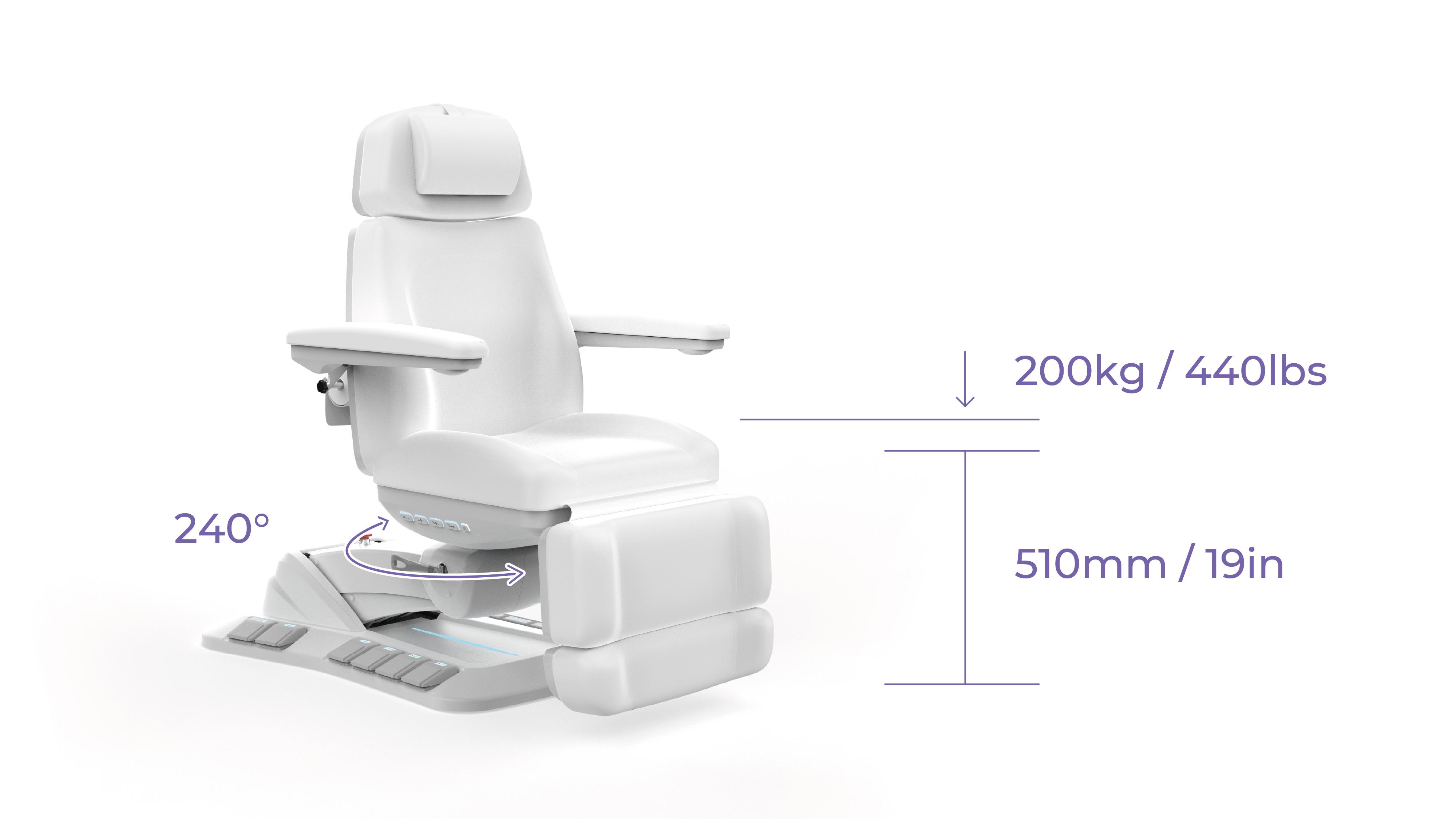 Since 2010, the 2246 Series has remained an industry benchmark through continuous innovation and deep customer insight. It has maintained strong market relevance over the years and earned the long-term trust of professional users worldwide. The new 2246EBN model combines smart technology and practical design for medical aesthetics and high-end spas. Certified by FDA and UL. Key Features: • 4-motor control: Adjust height, backrest, seat, and footrest quietly. With 2 memory function and reset function. • Use both built-in foot controller and hand remote control. • 240° rotation: Enables flexible positioning and easy access. • Practical accessories: Includes adjustable headrest, swivel & removable armrests, extended footrest, PVC foot cover and paper holder. •Easily detachable upholstery with stain-resistant microfiber leather for easy cleaning. • LED Ambient lighting: Creates a relaxing atmosphere.